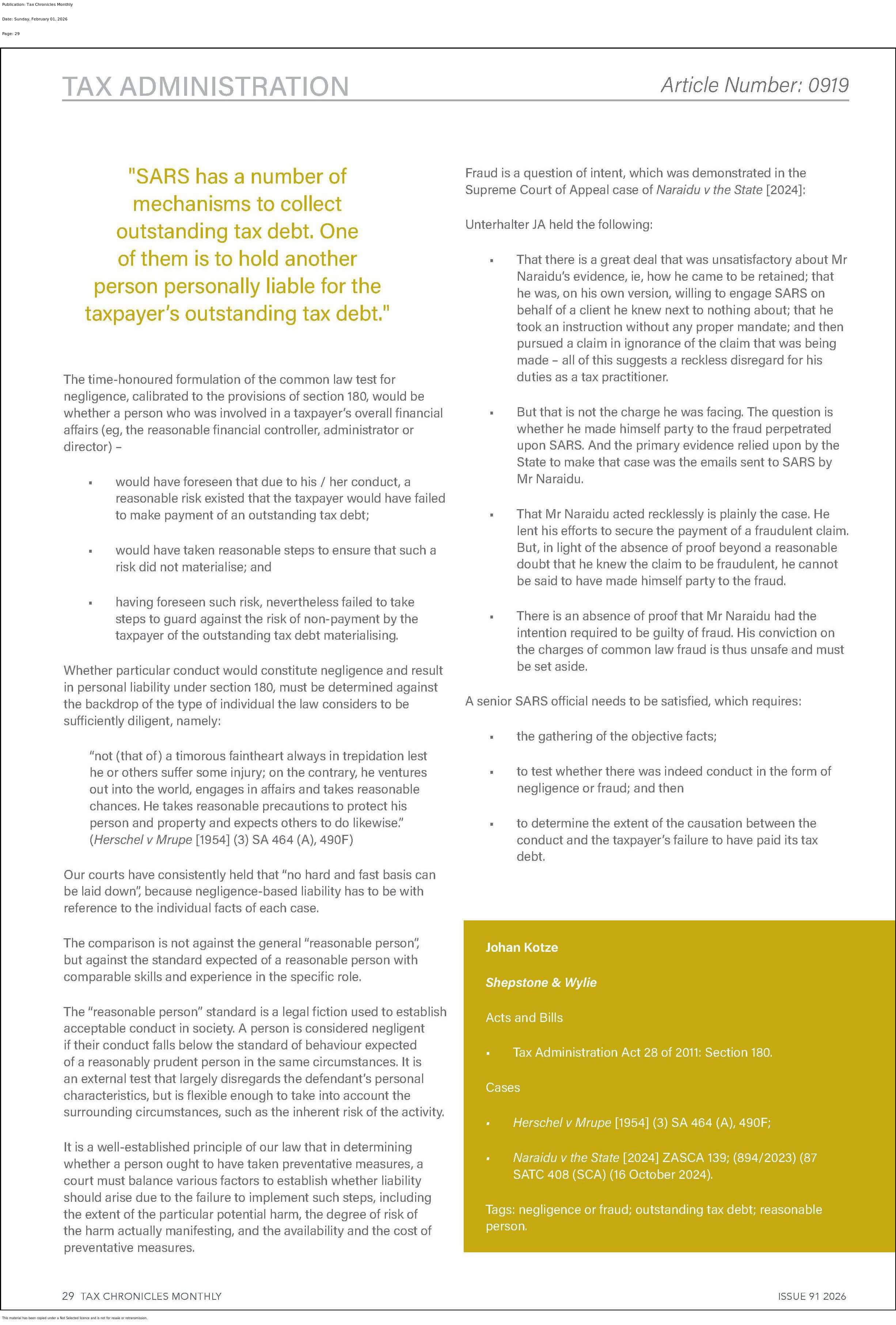 PERSONAL LIABILITY FOR ANOTHER TAXPAYER’S DEBT IN THE CASE OF NEGLIGENCE OR FRAUD