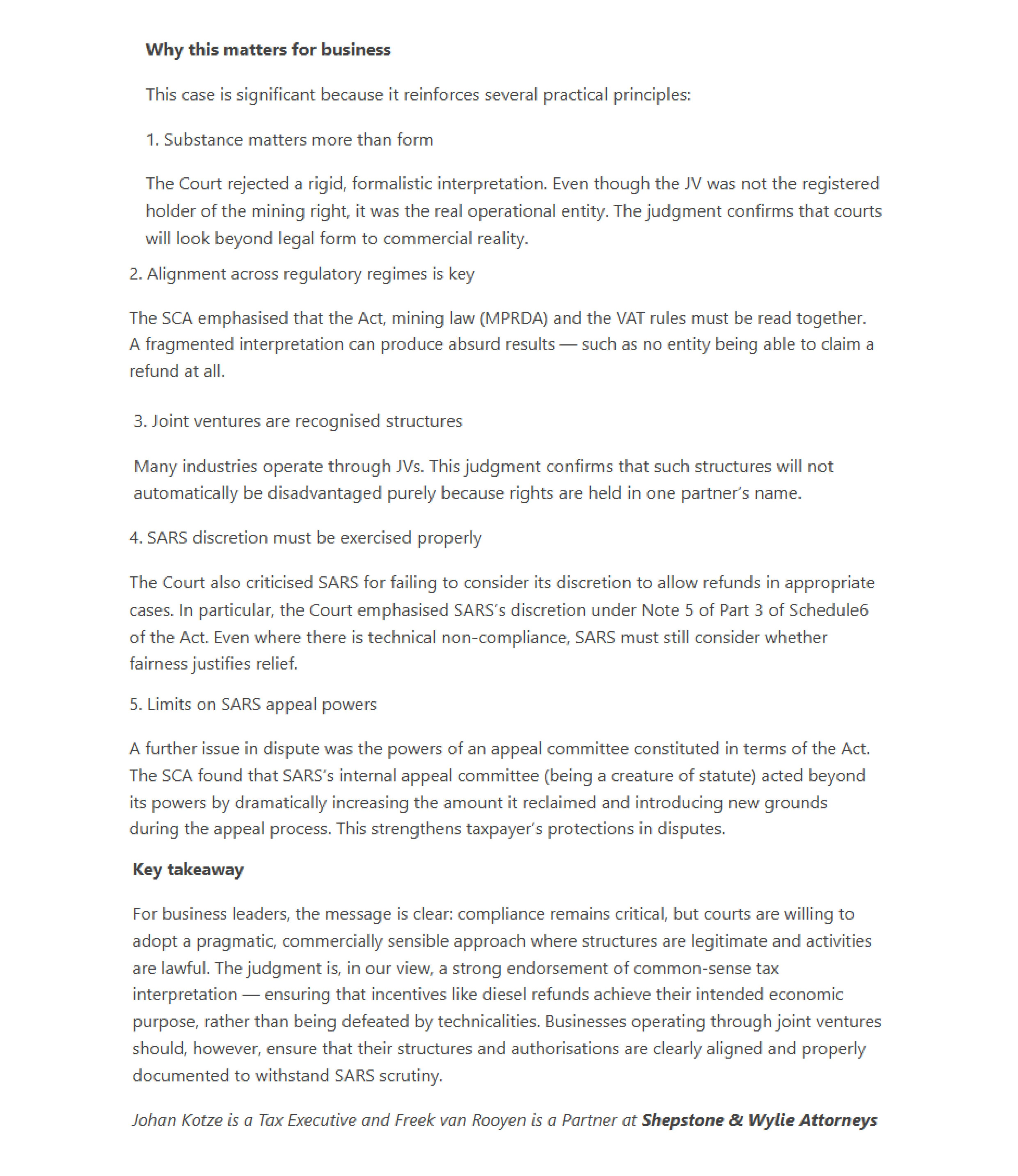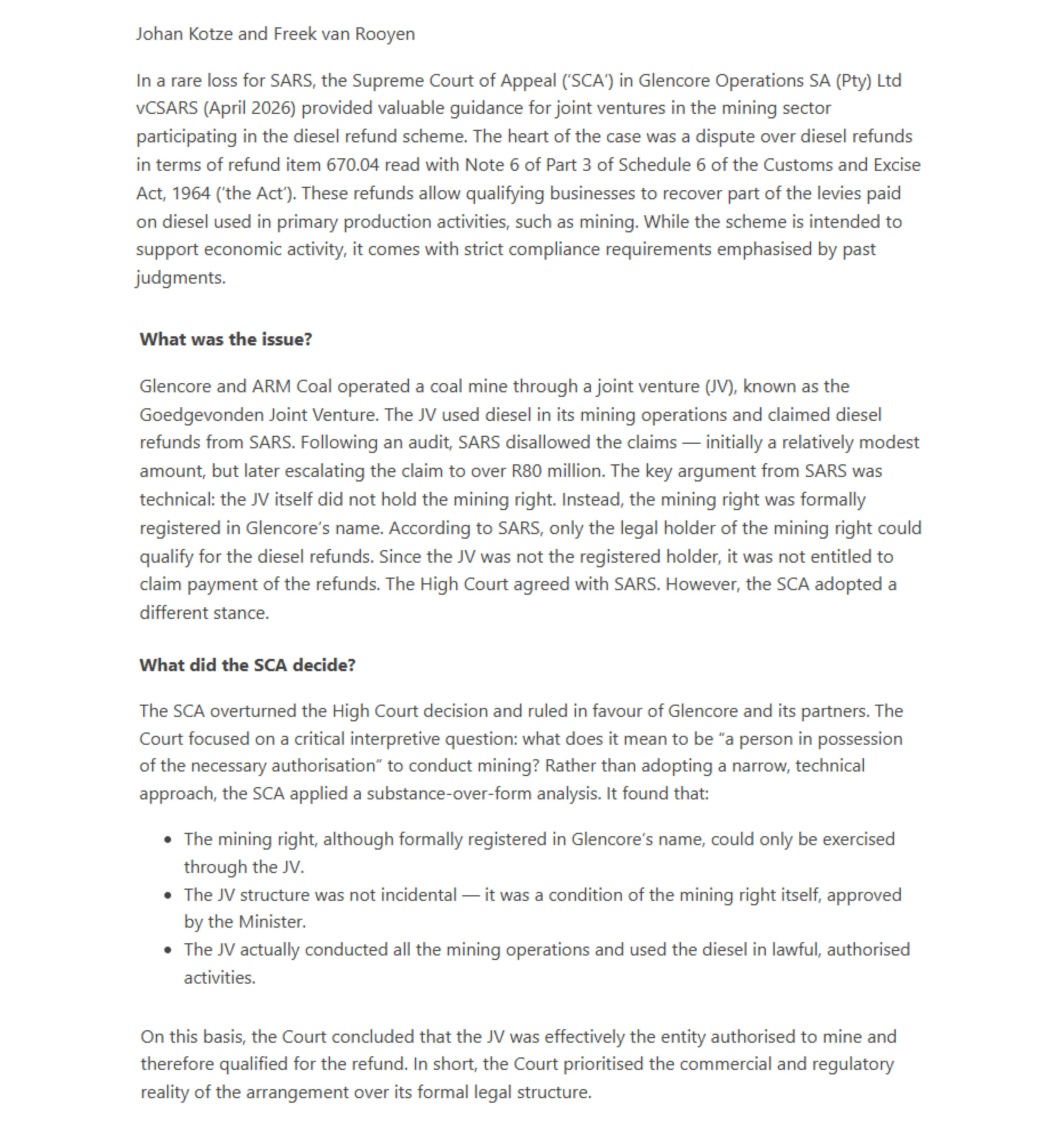 SCA ruling in favour of Glencore reshapes diesel refund landscape for joint ventures